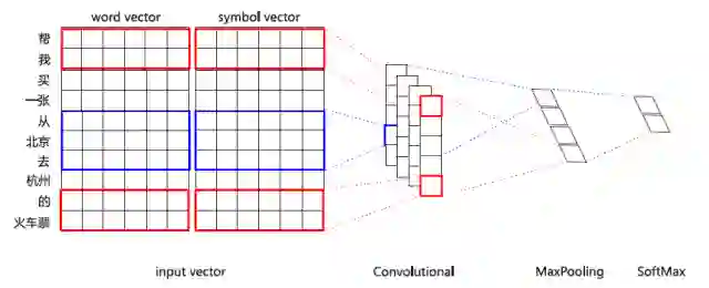 单纯以 word vector 为输入的 CNN 分类效果,在某些领域上无法超越复杂特征工程的 SVM 分类器。如何进一步提升深度学习的效果,其中一个探索方向就是试图把分布式表示和符号表示进行融合。比如对于「刘德华的忘情水」这句话,通过知识库可以标注刘德华为 singer、忘情水为 song,期望能把 singer 和 song 这样的符号表示融入到网络中去。具体融合方法,既可以把符号标签进行 embedding,然后把 embedding 后的 vector 拼接到 word vector 后进行分类,也可以直接用 multihot 的方式拼接到 word vector 后面。分布式表示和符号表示融合后的 CNN 结构如图 6 所示。