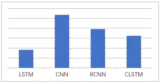 意图分类是一种文本分类,主要分为基于规则的方法、基于传统机器学习的方法和基于深度学习的方法,如 CNN[3]、LSTM[4]、RCNN[5]、C-LSTM[6] 及 FastText[7] 等。针对 CNN、LSTM、RCNN、C-LSTM 四种典型的模型框架,我们在 14 个领域的数据集上进行训练,在 4 万左右规模的测试集上进行测试,采用 Micro F1 作为度量指标(注:此处的训练和测试中,神经网络的输入只包含 word embedding,没有融合符号表示),结果如图 5 所示,其中 Yoon Kim 在 2014 年提出的基于 CNN[3] 的分类算法效果最好。
