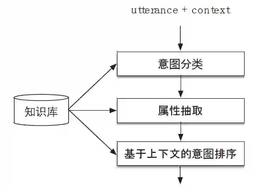 在表1 中,我们展示了一个例子,如果不看上下文,无法确定「后天呢」的意图。为了解决这个问题,在系统中我们设计了意图排序模块,其流程如图 10 所示。对于用户输入的 utterance,一方面先利用分类抽取模型去判定意图并做抽取;另一方面,直接继承上文的意图,然后根据这个意图做属性抽取。这两个结果通过特征抽取后一起送入一个 LR 分类器,以判定当前 utterance 是应该继承上文的意图,还是遵循分类器分类的意图。如果是继承上文意图,那么可以把这个意图及其属性抽取结果作为最终结果输出;如果是遵循分类器分类的结果,那么可以把各个结果按照分类器分类的置信度排序输出。