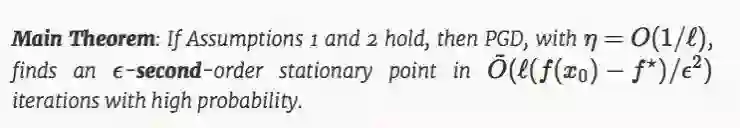 主要定理中,O~(⋅) 只隐藏了对数因子;这边对维度的依赖只有 log4(d).。定理证明,在一个额外增加的 Hessian-Lipschitz 条件下,增加扰动的 GD 收敛到二阶驻点的时间和 GD 收敛到一阶驻点的时间几乎是一样的。因此,我们可以得出结论,PGD 可以无消耗的逃离鞍点。