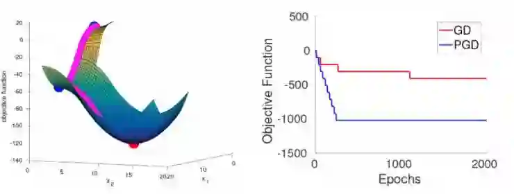 为了更好的解释这个结果,我们使用包括高斯(Gaussians)和均匀分布的超立方体来进行随机初始化,同时我们构建一个光滑的目标函数,满足假设 1 和 2。这个函数被设计成即使随机初始化,在很大概率上 GD 和 PGD 在达到局部极小值之前都需要依次经过 d 范围内的严格鞍点。所有的严格鞍点都只有一个逃逸方向(见下方左图,d=2)