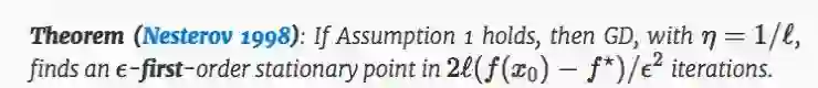 在这个定理中,x0 是初始点,f⋆ 是全局极小值的函数。定理规定任何 gradient-Lipschitz 函数,任何驻点都可以通过 GD 在第 O(1/ϵ2) 次获得,不受 d 的影响,这就是所谓的 “自由尺寸优化”。对一个 GD 的成本计算为 O(d),因此整体的运行时间为 O(d) 的阶。 O(d) 这样线性 scaling 对现代高维非凸问题(比如深度学习)来说是非常重要的。