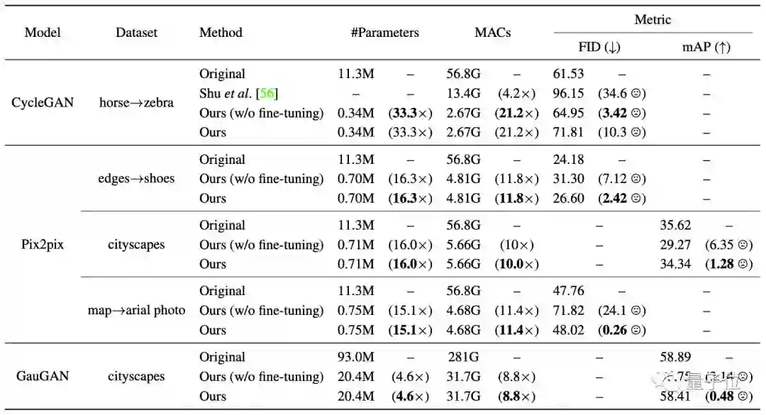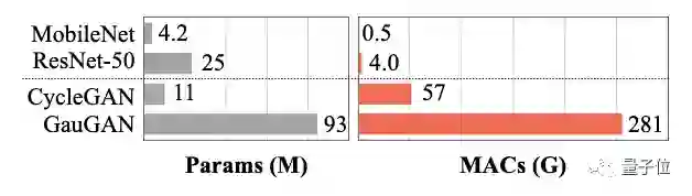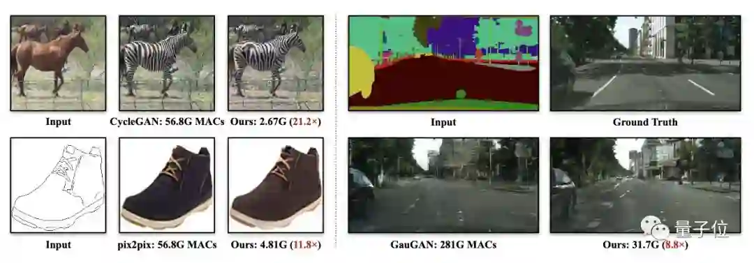 这种方法将CycleGAN的计算量减少了20倍以上,将pix2pix的计算量减少了9倍,将GauGAN的计算量减少了9倍。