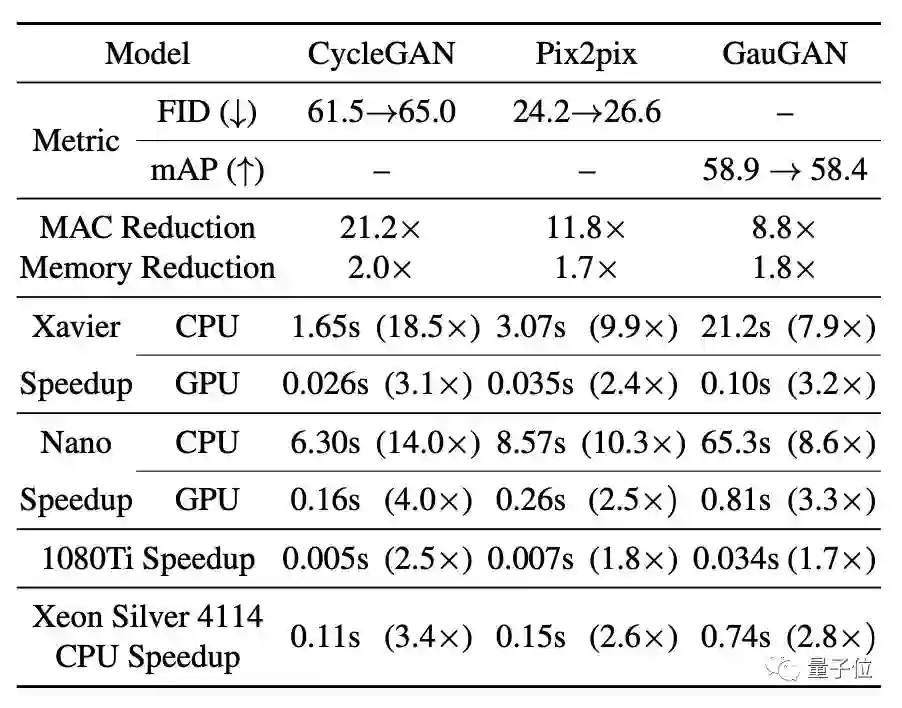 GAN压缩将乘法累加运算(MAC)的数量减了9~21倍。