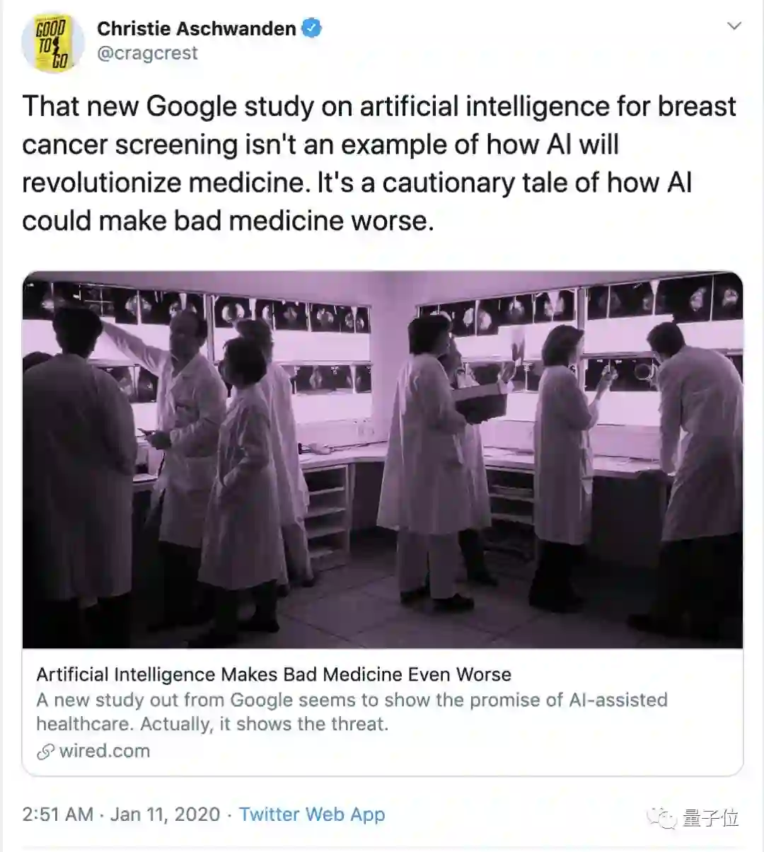 在谷歌AI检测乳腺癌实验发布的时候,Christie就发了Twitter: