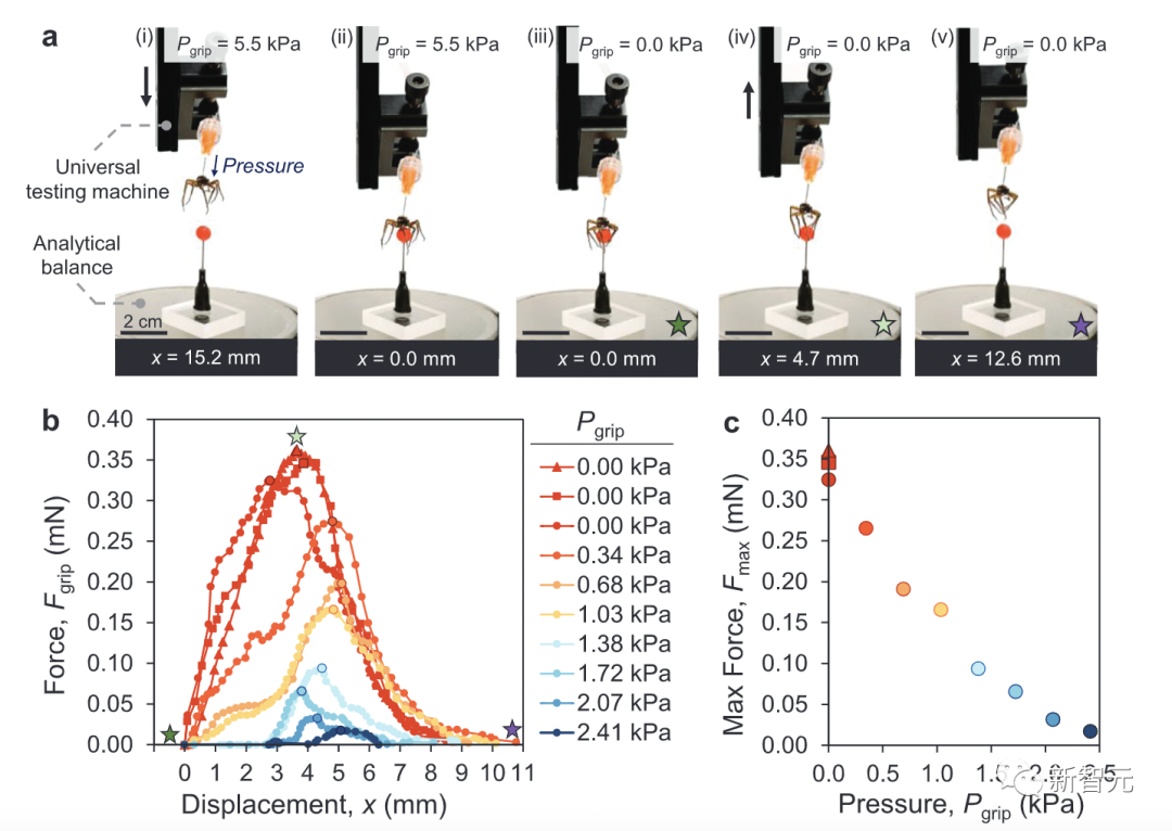 上图则是研究人员测试出的「僵尸蜘蛛」的抓力。通过对比八个不同的抓取压力结果发现,抓取压力的增加会导致抓取力的下降。