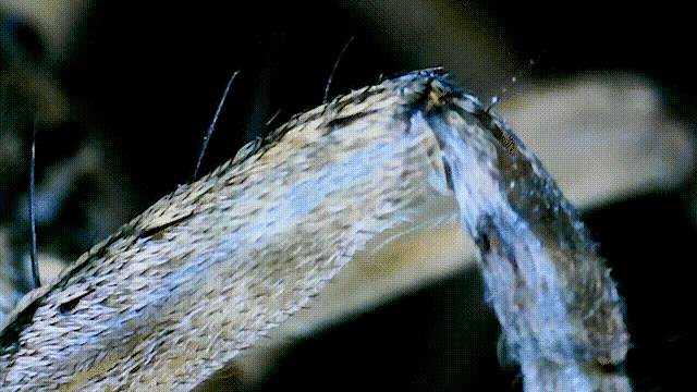 第二,胶水沿着针头向下移动,在重力的作用下接触到蜘蛛的角质层(或者叫外骨骼)的表面。