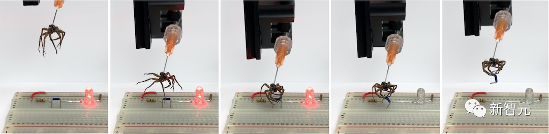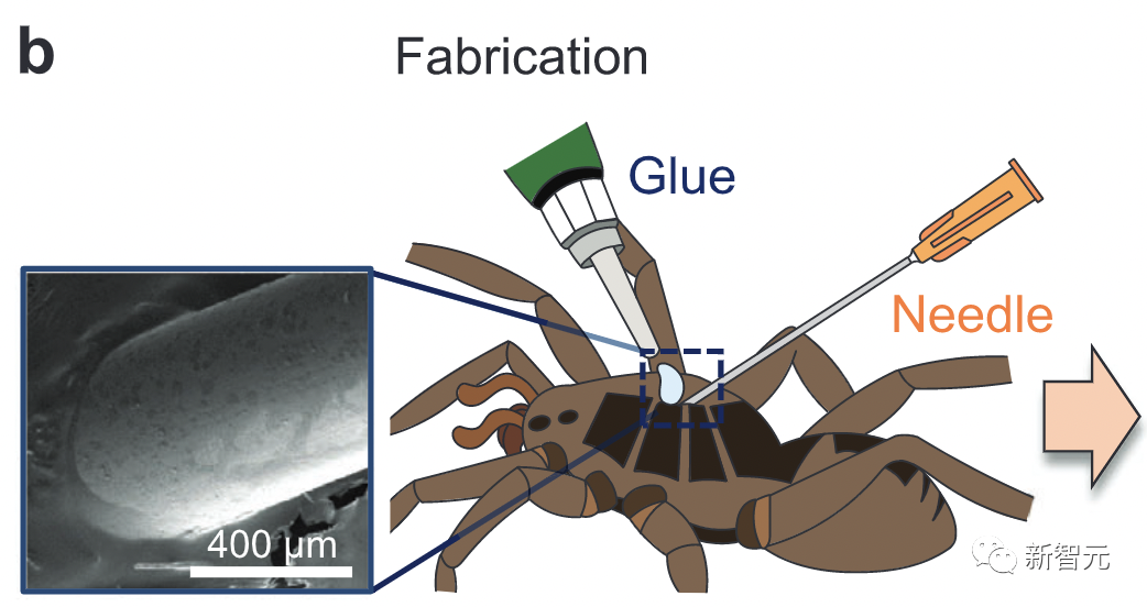 那就是将针头插入已死亡狼蛛的前肢区域,然后用胶水将针头固定在蜘蛛的身体上,最终形成一个密闭的圆圈。