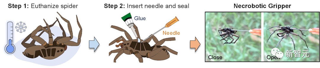 最后,在胶水凝固后(该研究使用的是氰基丙烯酸酯胶水,约10分钟凝固),将注射器连接到皮下注射针头的鲁尔锁端(Luer lock)。这样就完成了蜘蛛死体抓取器的制作。