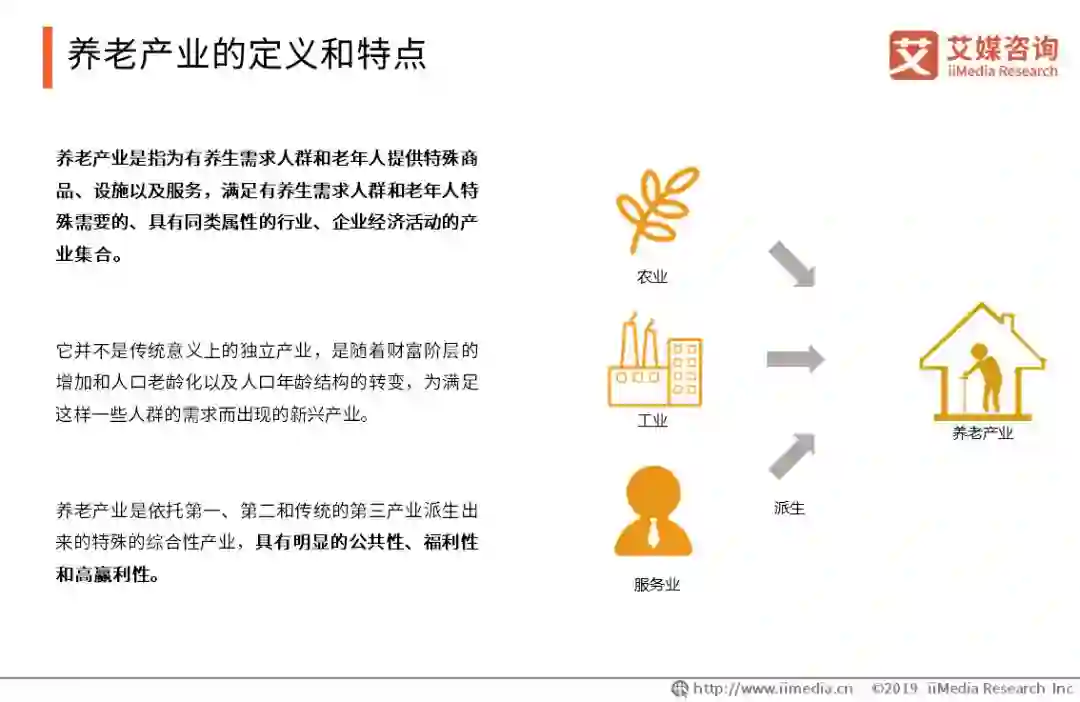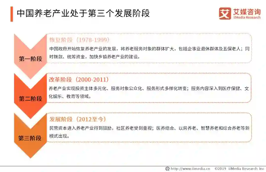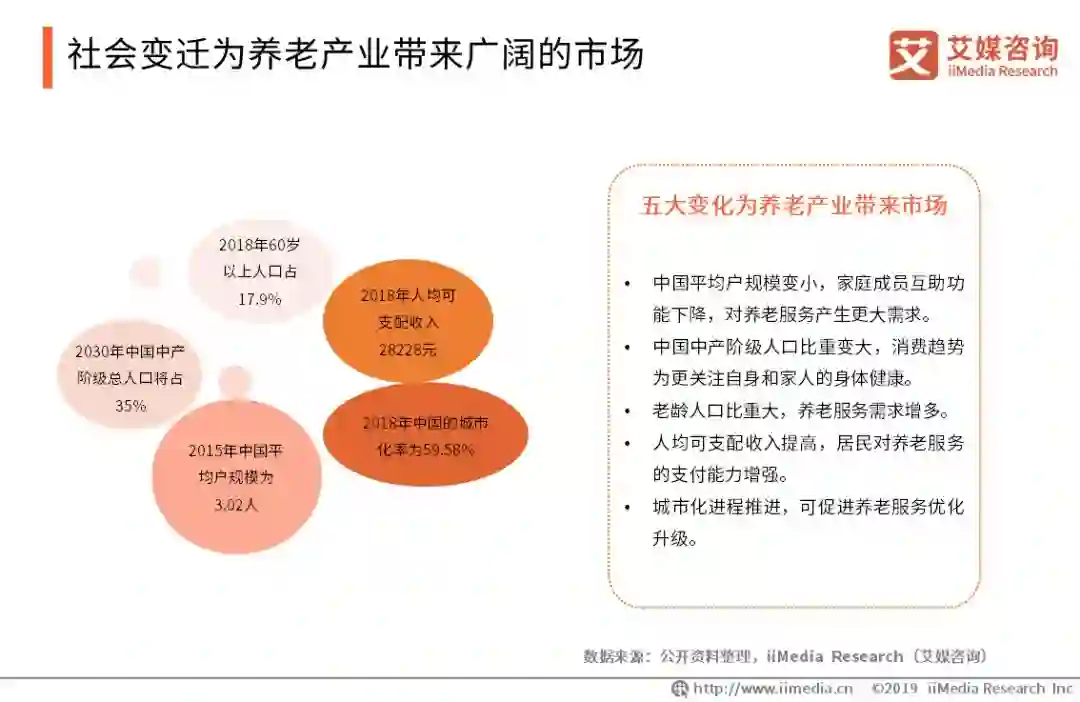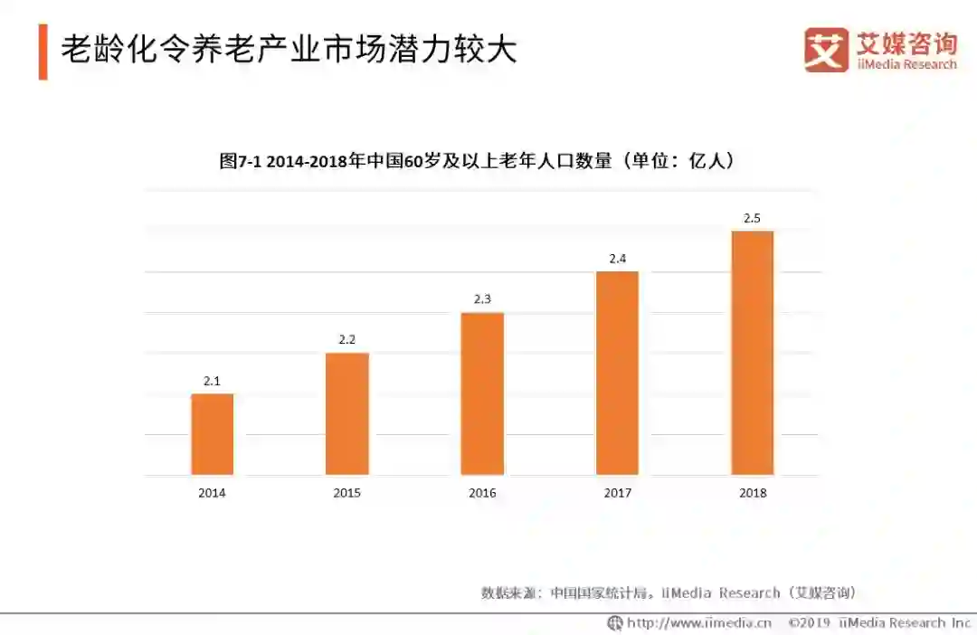 中国国家统计局数据显示,2018年中国60岁及以上的老人达2.5亿人,占总人口的17.9%。世界卫生组织预测,到2050年,中国或有35%的人口超过60岁,成为世界上老龄化最严重的国家之一。iiMedia Research(艾媒咨询)分析师认为,中国的老龄化问题日趋加剧,成为促使养老产业迅速发展的动力。