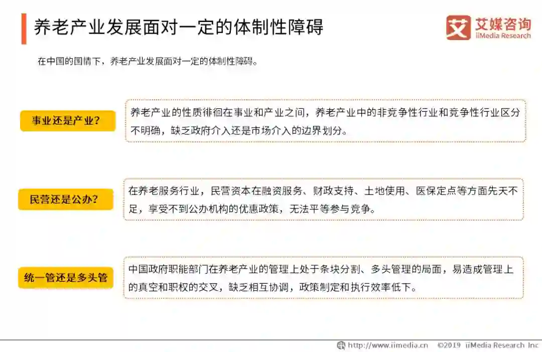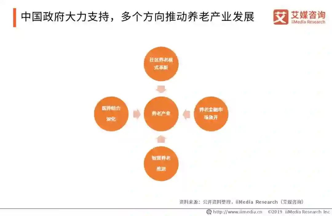随着人口老龄化的加剧,国家越来越重视养老产业的发展,发布了一系列政策扶持。结合当下养老产业发展状况和养老产业政策热点,艾媒咨询分析师认为,中国政府支持社区养老模式革新、医养结合深化、智慧养老推进和养老金融市场放开等多个方向改革与开发,推动了养老产业发展。