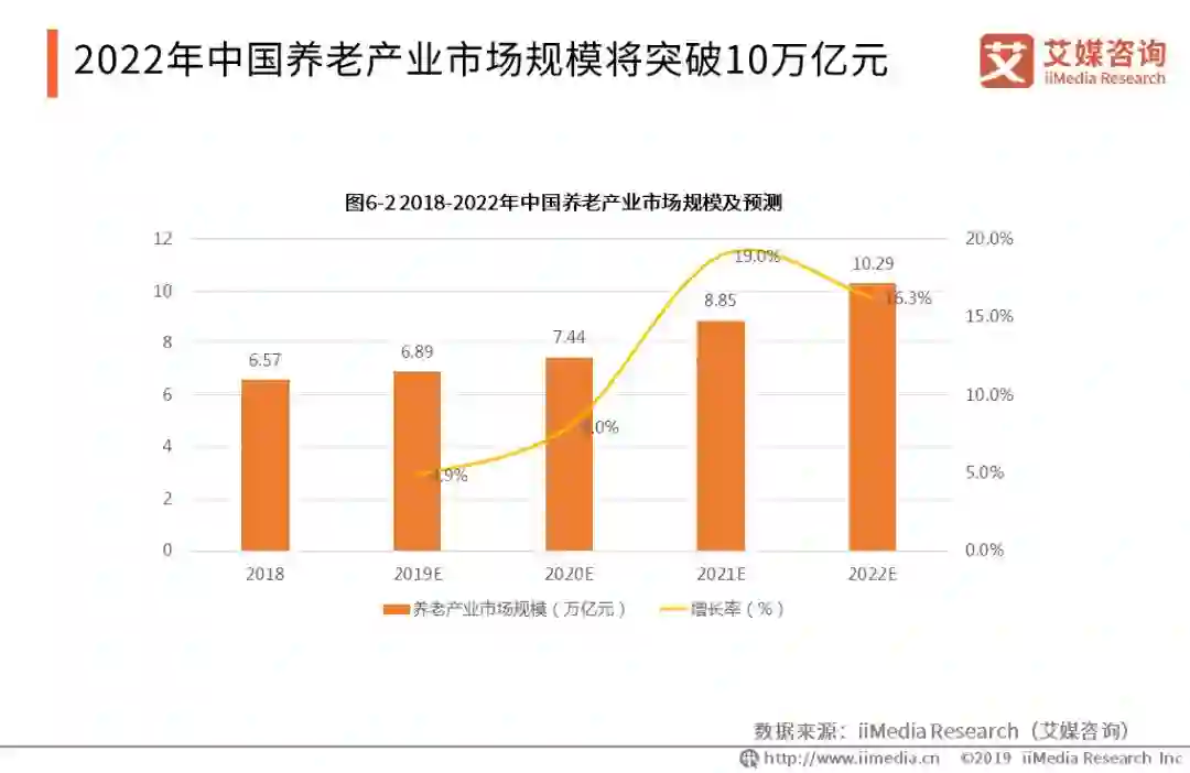 中国养老产业市场规模逐年增长,iiMedia Research(艾媒咨询)数据显示,2018年中国养老产业市场规模达6.57万亿元,预计2022年可达10.29万亿元。