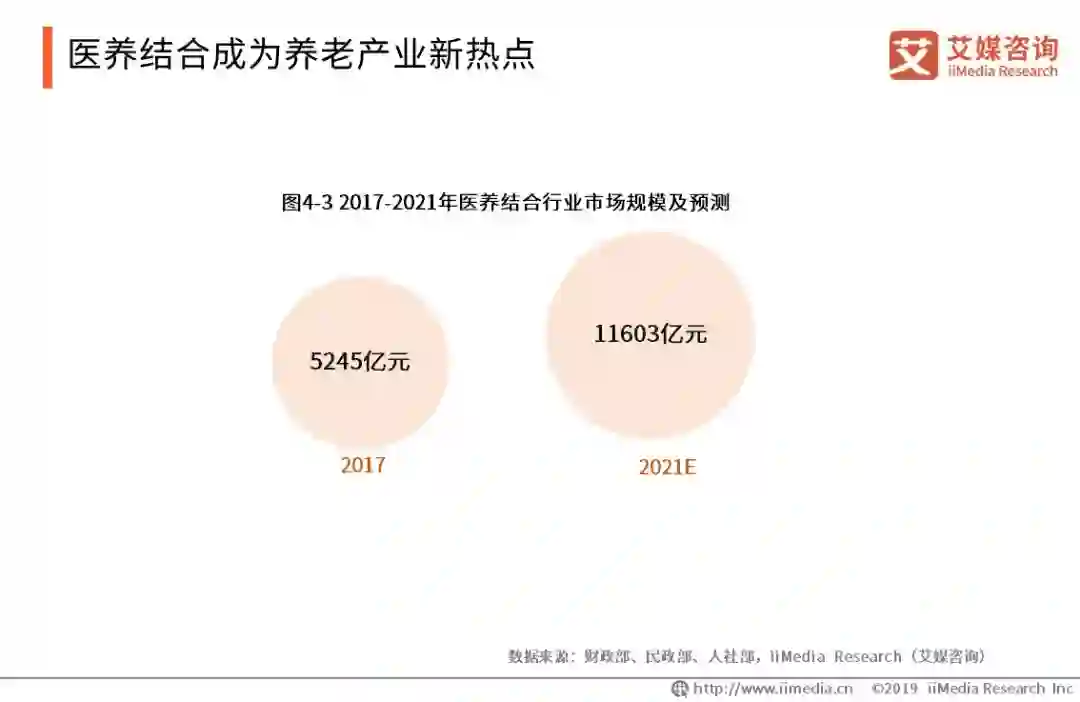 “医养结合”是指推进现有医疗卫生和养老机构合作,发挥互补优势,实现社会资源利用的最大化。在国家政策的推动下,医养结合成为养老产业发展新热点,预计2021年中国医养结合行业市场规模将突破1万亿元。
