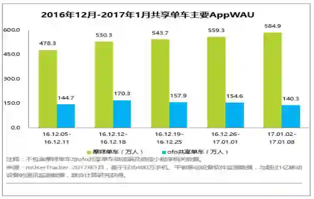 通过分析mUserTracker发布的监测数据,Mobike摩拜单车App与ofo共享单车App用户相对于其他共享单车,规模上占有领先的优势,周度活跃用户(weekly active users),简称WAU,不论是摩拜单车还是ofo共享单车,在2016年12月均已达到百万量级以上,成为移动出行行业中覆盖率较高的应用。不过,下图数据显示,计算出摩拜单车周活跃用户量已经是ofo 4.2 倍,日均总有效使用时间达ofo 3.6倍。