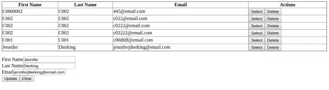 我们这样就创建了 Form,每个 Form 包含三个输入,它们绑定到组件中声明的 firstName、lastName 和 email 变量。我们还添加了三个按钮,用于创建新联系人、更新选定的联系人和清除该 Form。