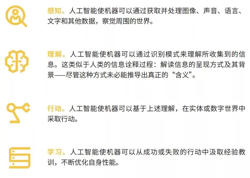 我们并未像许多人那样,不断尝试去明确地描述人工智能,而是倾向于将此类技术视为一套能力框架。毫无疑问,这是了解人工智能、知晓其背后广泛技术的最佳方式。我们的框架以人工智能支持机器实现的主要功能为核心,其中包括以下四个方面: