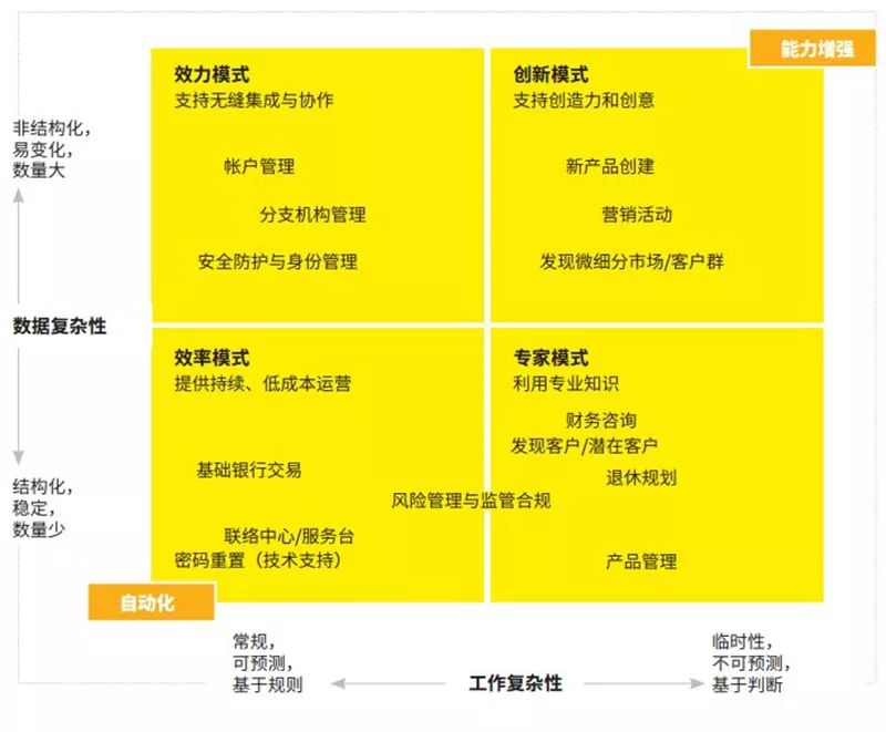 随着企业持续加大人工智能的应用力度,系统所能处理的数据和工作的复杂性必然有增无减。若想了解其如何在业务环境中发挥作用,下方框架可能会有所帮助。此框架列出了各种技术的潜在应用形式(本文以金融服务行业为例),并根据所涉及数据和工作的复杂程度,将人工智能应用分为四大模式——效率、效力、专家、创新。
