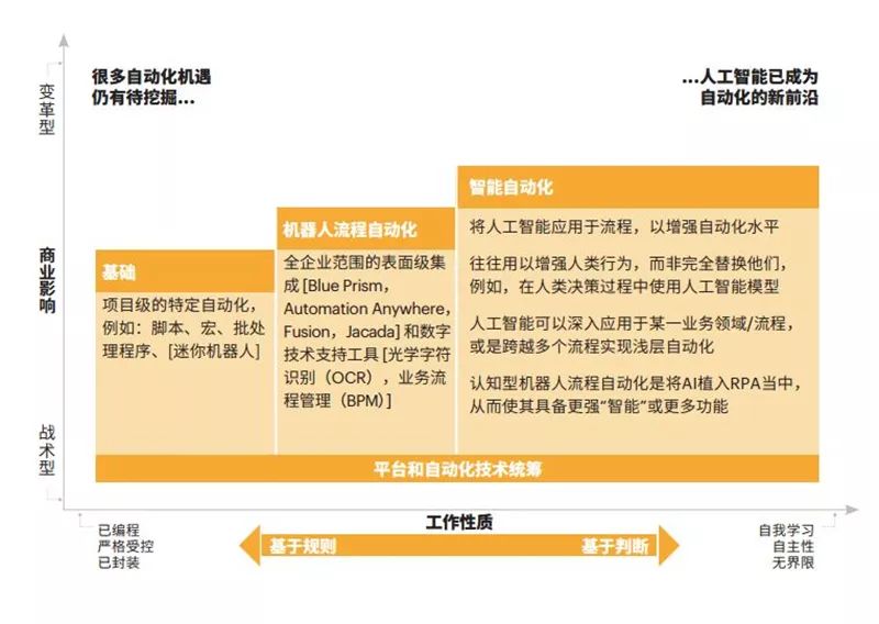 人工智能已成为自动化的新前沿。借助具备自我学习能力的自动化系统,充分利用机器学习、计算机视觉、知识表达和推理等技术模仿人类行为,人工智能可以使自动化超越仅基于规则的预测性工作,延伸至我们目前认为需要人类判断的领域当中,从而创造出大量全新的自动化机遇 。