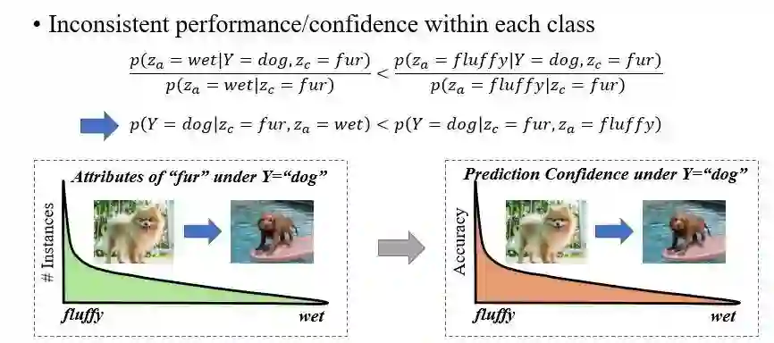 的取值不同 attribute bias 项会使同一类的样本出现难易之分(如潮湿的皮毛在狗的类别内特别罕见则会使得潮湿的狗变为困难样本),即图 4 的例子。其次,属性偏见(attribute bias)还能解释类别之间是如何产生错分的。比如潮湿的皮毛在河狸类中就很常见,因为河狸大多生活在水里,这就给“潮湿的皮毛”与“河狸”之间产生了伪相关性。让潮湿的狗有很大概率被错分为河狸,也就是图 5 的例子。