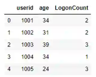 运行上述程序,结果如图1和图2,分别展示了2个数据集的前5个样本,其中数据集OldUserInfo包含4个变量,分别为userid(用户id)、age(用户年龄)、LogonCount(截止建模时间的登陆APP次数)与y(目标变量),其中y变量表示用户是否购买了产品A,数据集NewUserInfo包含3个变量,由于此数据集为新客户的信息,尚无购买产品A的记录,这里主要是为了说明问题,真实情况下用户的注册信息可能更多。
