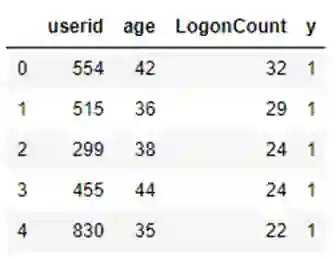 数据集olduser_train的基本信息:<class 'pandas.core.frame.DataFrame'>RangeIndex: 1000 entries, 0 to 999Data columns (total 4 columns):userid 1000 non-null int64age 1000 non-null int64LogonCount 1000 non-null int64y 1000 non-null int64dtypes: int64(4)memory usage: 31.4 KBNone数据集newuser_test的基本信息:<class 'pandas.core.frame.DataFrame'>RangeIndex: 400 entries, 0 to 399Data columns (total 3 columns):userid 400 non-null int64age 400 non-null int64LogonCount 400 non-null int64dtypes: int64(3)memory usage: 9.5 KBNone