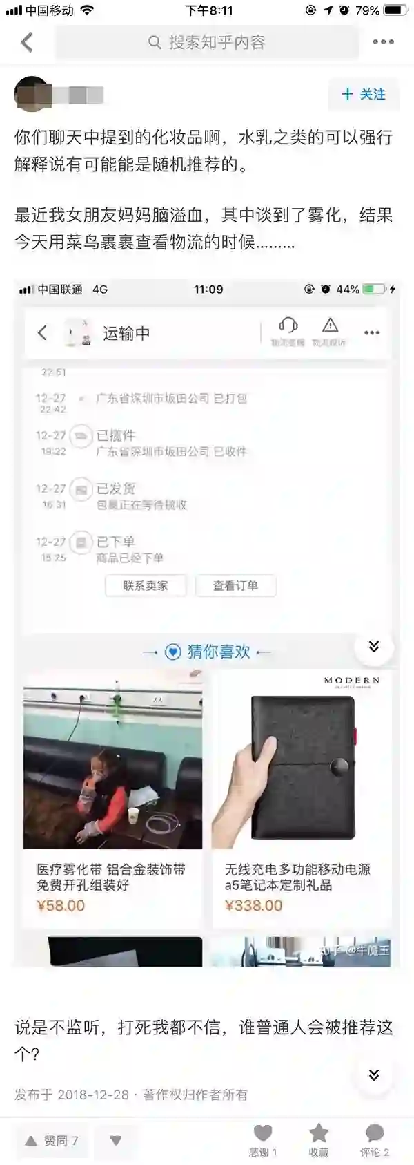 无独有偶,2018年12月28日,也有网友发帖称,其女友妈妈患脑溢血,聊天时曾谈到“雾化”,随后在使用“菜鸟裹裹”查看物流时,在“猜你喜欢”一栏中看到了医疗雾化带的推荐。