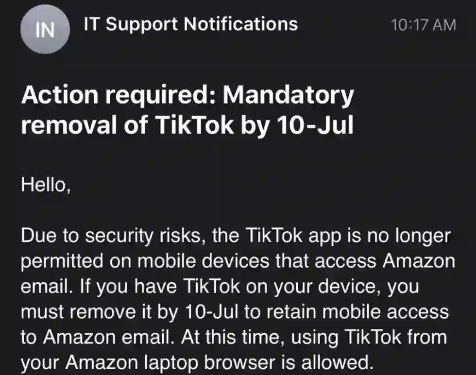 今日早些时候,据《纽约时报》报道,亚马逊给员工(截至第一季度末,亚马逊在全球范围内拥有约 84 万名员工)发送了一封邮件,称出于“安全风险”考虑,员工禁止在可以访问工作邮箱的手机上使用 TikTok,已经安装的必须在 7 月 10 日之内删除。但员工可以在电脑端的浏览器上继续使用 TikTok。纽约时报记者泰勒·洛伦兹在推特上公布了这封电子邮件的截图。