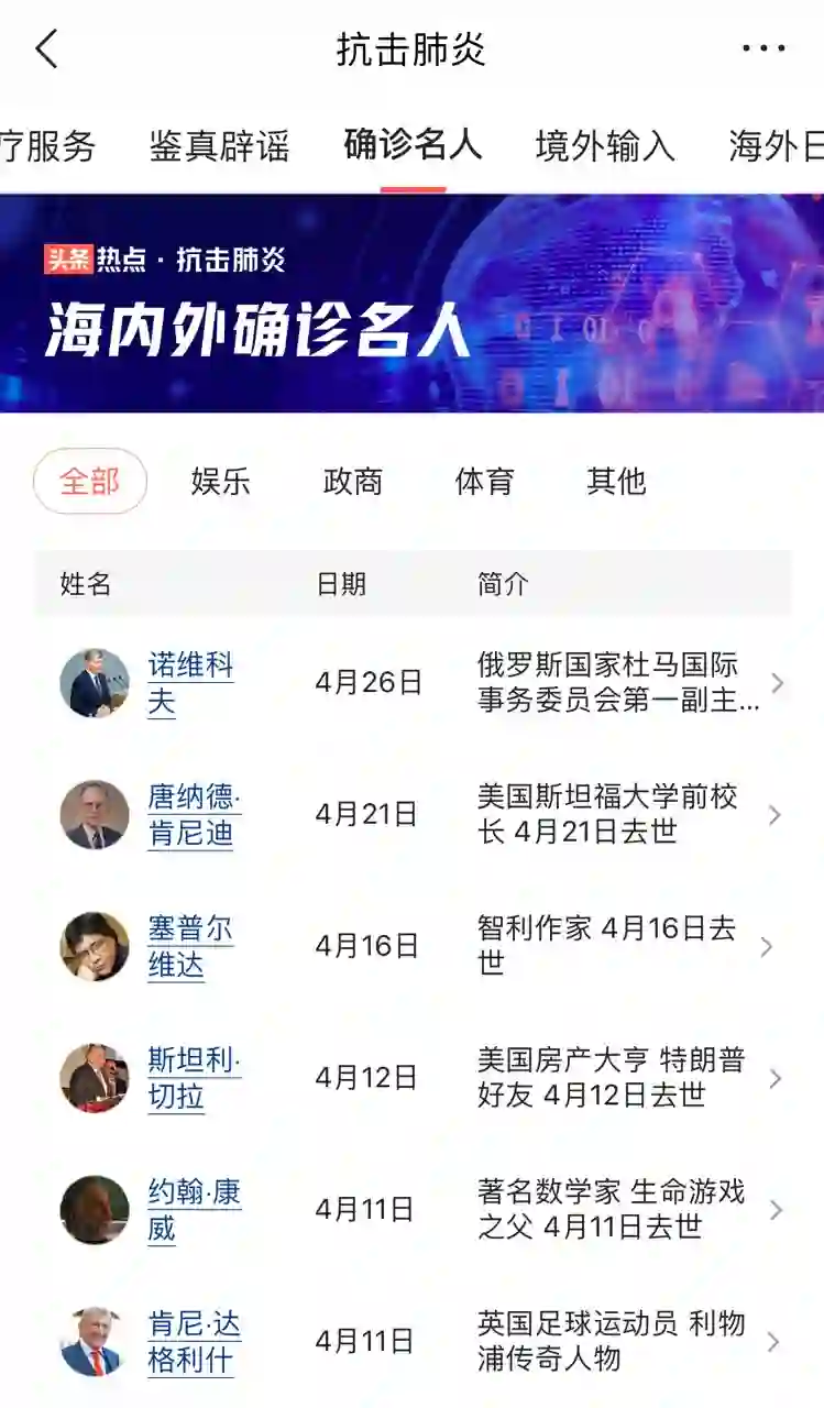 甚至在国外疫情发展迅猛的时候,推出海外确认名人板块,从某种程度上满足了国内用户的看热闹心理。