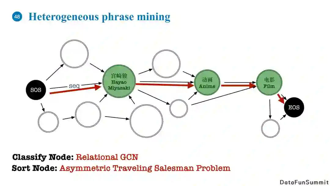 第二,我们需要对抽取的词语做排列,形成一个短语而不是词的集合,我们将其转化为非对称最短旅行商问题,即我们需要从SOS出发EOS结束的路线中找到一条长度最短且经过所有被Relational GCN分类为正的路线。这个问题有现成的算法可以直接使用。