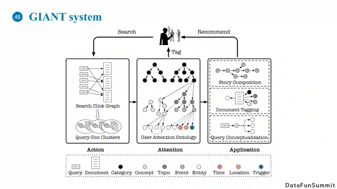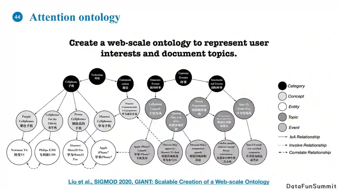 我们发表在SIGMOD 2020的工作主要是建立了一个本体,其利用大量的用户query和相应的点击文章去抽取不同用户的信息点,包括不同的话题短语、事件短语、概念短语、实体,以及人工定义的高层次类目(如科技、时事、手机等)。上图黑色的节点代表着category,即人工定义的类目,灰色节点代表挖掘的概念、事件、话题等,比如颜值高的手机、辞职演讲、欧盟公布脱欧协议等,还有各种实体(如各类手机等)。其中本体图中最主要的关系是上下位关系,它代表着节点之间的从属关系。