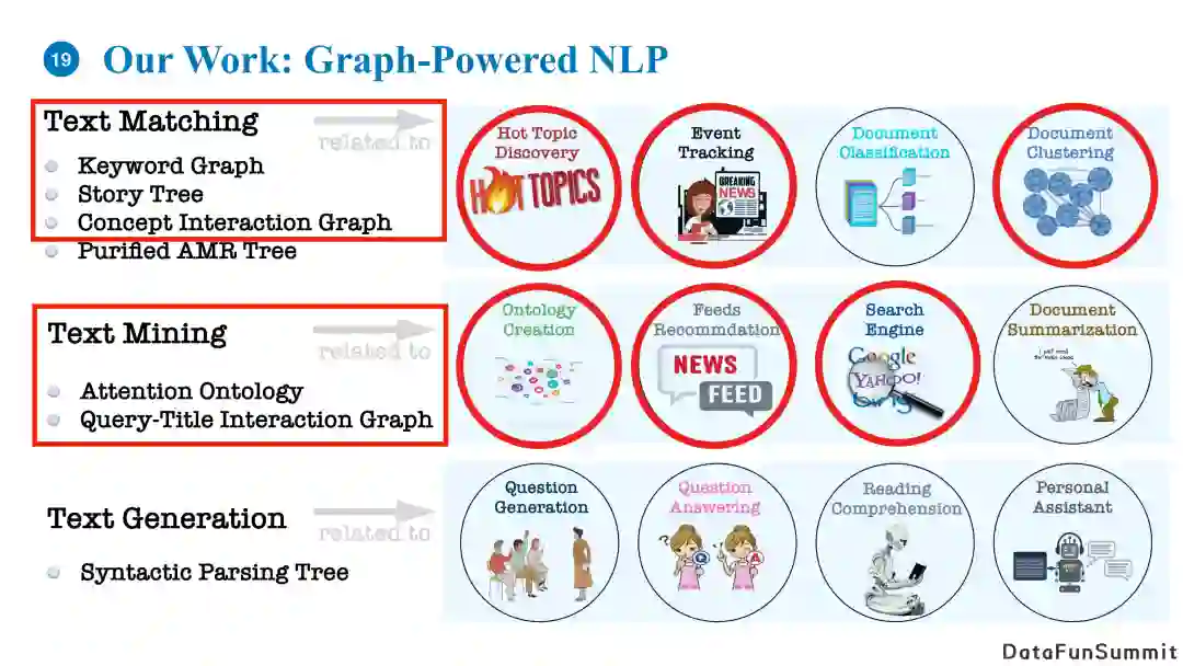 我们之前的工作覆盖了NLP领域内不同的任务,包括文本匹配、文本挖掘和文本生成,并且将它们应用到了一些列不同的应用中。我们今天分享的应用主要是基于图结构进行建模,并将其使用在文本匹配进行热点事件的挖掘和分析,细粒度文本的聚类,以及通过对用户兴趣点的建模来提高信息流的推荐搜索。