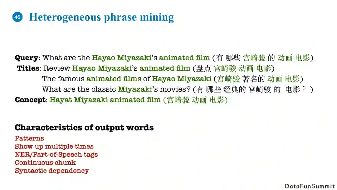 这里的核心问题在于如何从query-doc聚类中抽取出不同信息点的短语。例如上图的库组,我们可以抽取出“宫崎骏的动画电影”这一概念。我们经过分析得出短语作为关键信息点的特点: