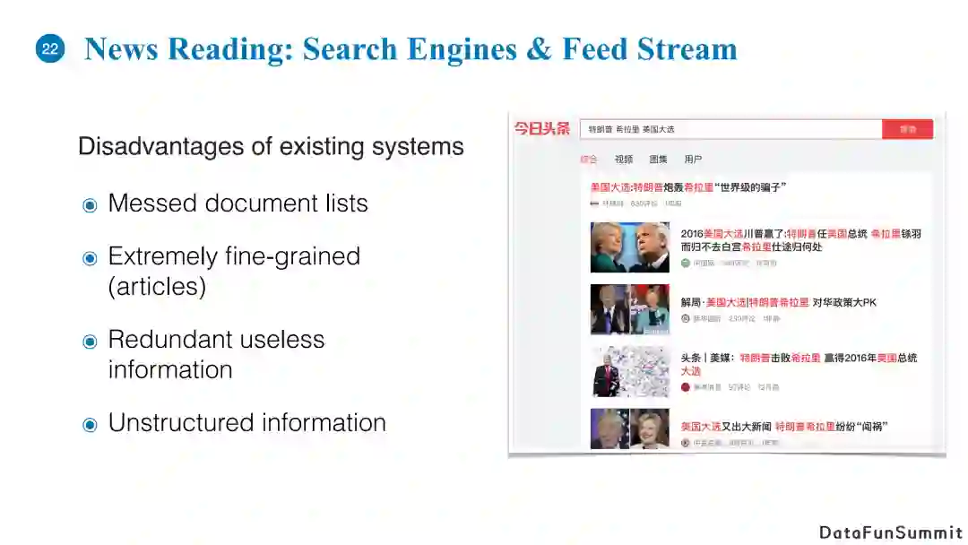 但这种做法有一些缺陷。首先,你所得到的文章列表中,文章之间不存在有意义的结构。另外,每个文章刻画的信息是十分细粒度的,文章与文章之间存在重复信息,即对于同一件事情,不同的媒体报道的内容大部分是重合的,这样就形成了信息的冗余。反之,如果两个新闻之间是关于同一个话题的,但是它们的冗余度比较少,你其实并不知道它们之间的关系是什么样的。