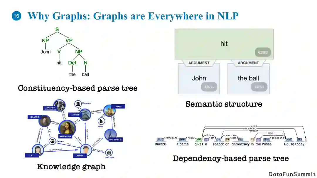 自然语言处理领域其实存在很多图结构,比如语法书、语义图、知识图谱等。从语言本身来说,自然语言是一种非常灵活的、具有可组合性的以及具有层级结构的事物,也就是说一句话的完整语义是可以被不同层级的多个细粒度语义组成的。例如一个相同语义的主动句和被动句,如果我们以一种图的方式来表达它们的话,我们会发现它们的语义层级结构其实是相同的,即使它们的顺序结构存在差异。也就是说图结构能够表达出自然语言的灵活组合性以及层级结构。