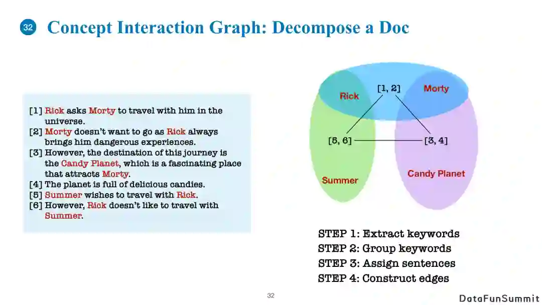 例如一篇文章有六句话。首先我们可以提取文章中所有关键词,并使用关键词构建概念交互图(Concept Interaction Graph)。具体地,我们会将关键词进行聚类(复用community detection的方法),当然分组的算法是可以自由选择的。然后,我们将一篇文章中的每一句话根据相似度分配至不同的关键词群中。最后,我们计算每一组关键词群和其他关键词群之间的相似度,根据计算结果建立带权重的边。