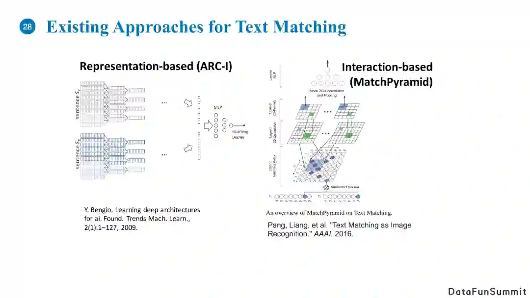 但是这两类方法对于长文本匹配不适用。首先,对于长文本,模型很难精准地取编码语义信息;第二,如果将一个长文本其中一到两句话进行打乱,实际上对文本的整体语义影响不大,但是对于encoder来说这两种输入截然不同,最终得到的隐向量的差异就很大;第三,这两类方法的时间复杂度较高,例如基于交互的模型在计算相似度时是O(n^2)的复杂度,当文本长度较大时时间消耗就很大。