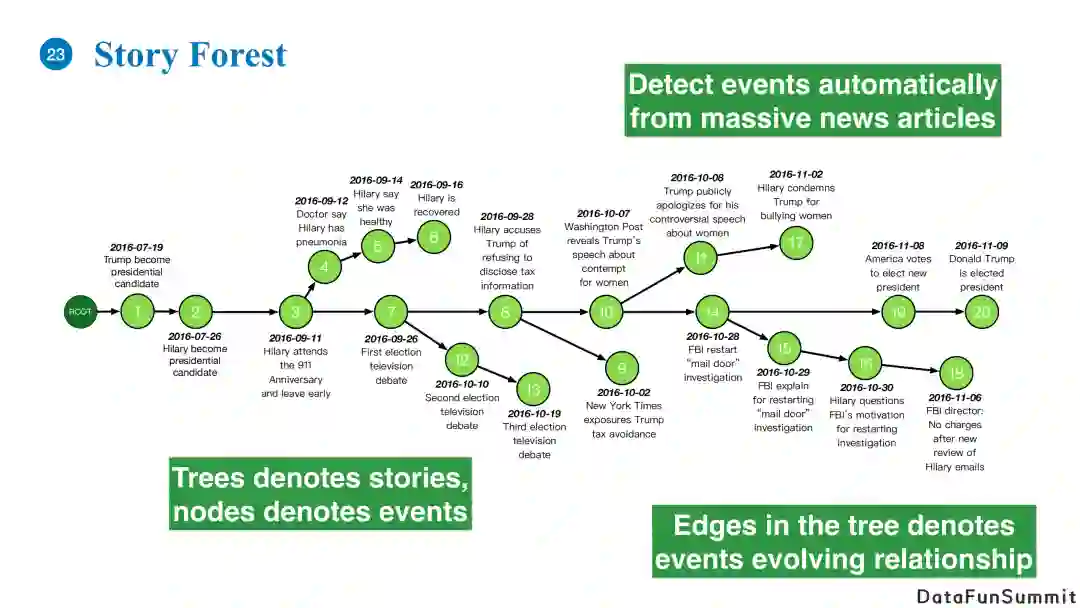 我们提出的story forest系统想利用图结构有效地组织信息,减少它们之间的冗余,并且理清它们之间的发展关系。例如上图的例子,针对2016年美国大选,我们可以把相关事件整理成一个story,每个绿色节点代表一个事件。我们认为一个事件是发生在某一个时间点,包含一群人或者一些实体的一个事情。Story中会包含一些分支,如上图希拉里的健康门,三次电视大选,希拉里的邮件门等。通过一个树形结构,我们能够纵览故事的全局发展,并且追踪其中的某一些分支。每一个节点把关于同一个事件的所有报道都聚类其中,不同事件之间具有相关性,我们可以根据时间点的发展以及事件之间的紧密程度构建如上图所示的树结构。