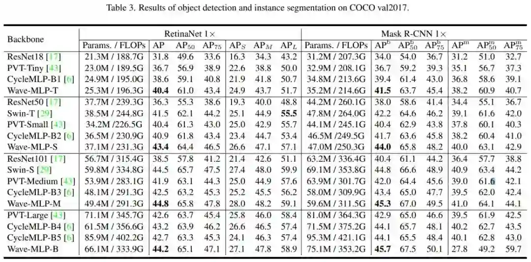 在下游目标检测、语义分割等任务中,Wave-MLP 同样表现出更优的性能。