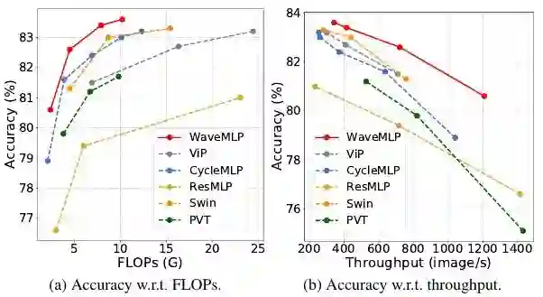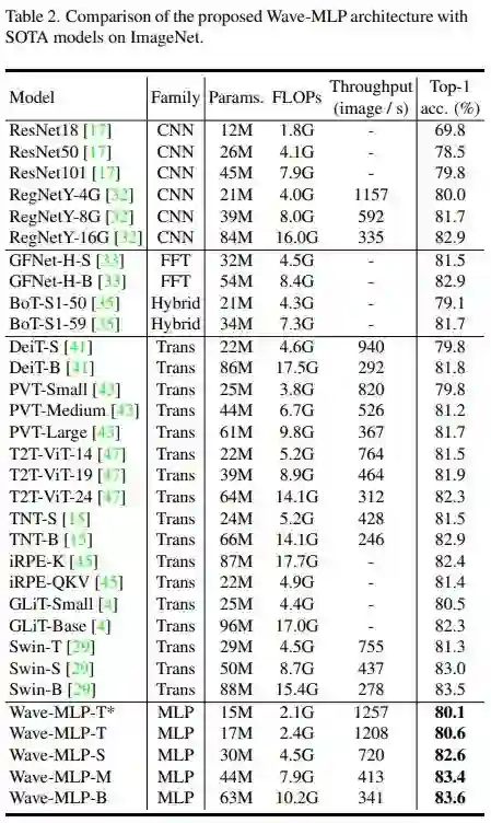 ImageNet 上图像分类的结果如表 1,表 2 所示:相比于现有的 Vision MLP 架构和 Transformer 架构,WaveMLP 都取得了明显的性能优势。