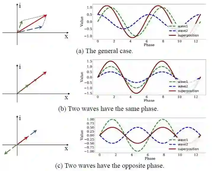 两个 Token 之间的相位差对它们的聚合过程有很大影响 (如下图 3 所示)。当两个 token 具有相同的相位时,它们会相互增强,得到幅值更大的波(图 3(b));当两个 token 相位相反时,他们合成的波将相互减弱。在其他情况下,它们之间的相互作用更加复杂,但仍取决于相位差(图 3(a))。经典方法中使用实值表示 token 的,这实际上是上式的一个特例。