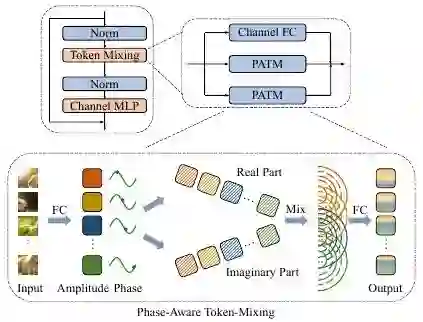 那么,对于视觉 MLP 中的图像块,能不能也把它表示成波的形式呢?该研究用幅值表达每个 Token 所包含的实际信息,用相位来表示这个 Token 当前所处的状态。在聚集不同 Token 信息的时候,不同 Token 之间的相位差会调制它们之间的聚合过程(如图 3 示)。考虑到来自不同输入图像的 Token 包含不同的语义内容,该研究使用一个简单的全连接模块来动态估计每个 Token 的相位。对于同时带有幅度和相位信息的 Token,作者提出了一个相位感知 Token 混合模块(PATM,如下图 1 所示)来聚合它们的信息。交替堆叠 PATM 模块和 MLP 模块构成了整个 Wave-MLP 架构。