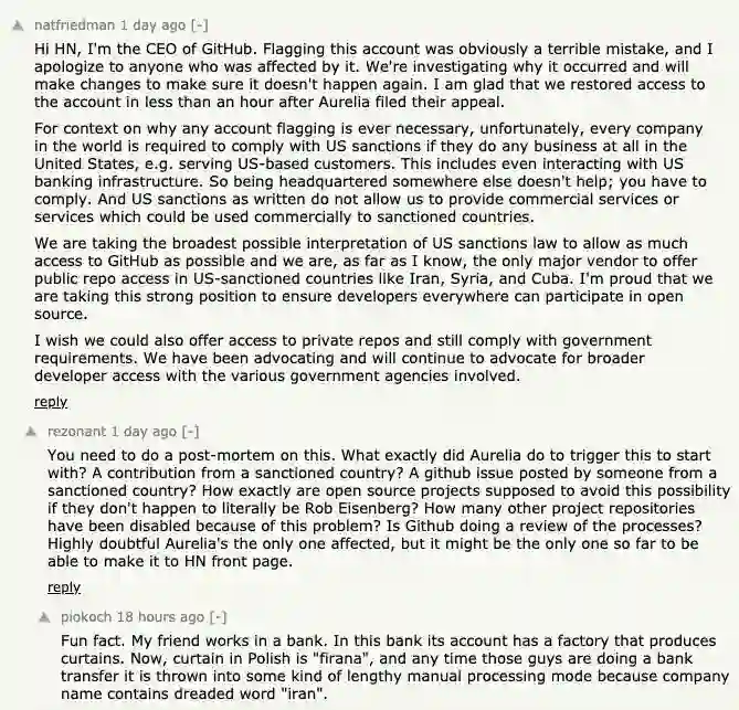 随后,在开发者不断的质疑声中,GitHub CEO Nat Friedman 在 Hacker News 上进行了回应并道歉。Friedman 这样说道:「关闭这个账户显然是一个可怕的错误,我向所有受到影响的人们道歉。我们正在调查此事发生的原因,并将做出改变以确保此类事件不再发生。我很庆幸的是,在 Aurelia 申诉不到一个小时的时间内,我们就恢复了对它的访问。」