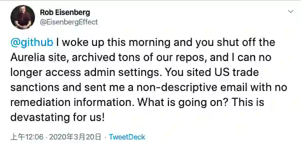尽管同属微软,但 3 月 20 日,Rob Eisenberg 依然不得不通过 Twitter 公开 @GitHub 来解决 Aurelia 被封禁的问题。他在 Twitter 上这样质问 GitHub:「我今早醒来,你关闭了 Aurelia 站点,大量 repos 归档,我也无法再访问 admin 设置。你提出了美国贸易制裁,并给我发了一封没有任何补救信息的非描述性邮件。到底是怎么回事?这对我们来说是毁灭性的打击!」