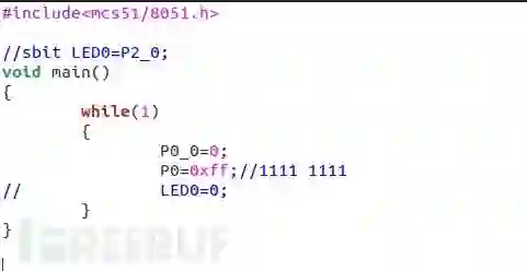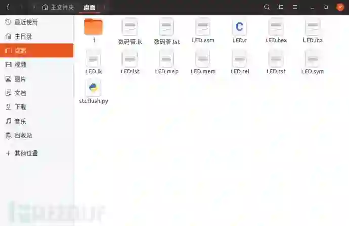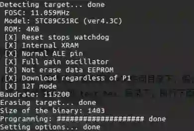 这时候我们可以执行1(stcflash.py)这个脚本了,这时候切换到工作目录中,写一个51单片机的程序。在Linux下写的和Windows下写程序会有一些不同的地方。