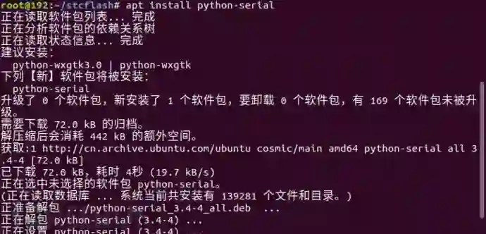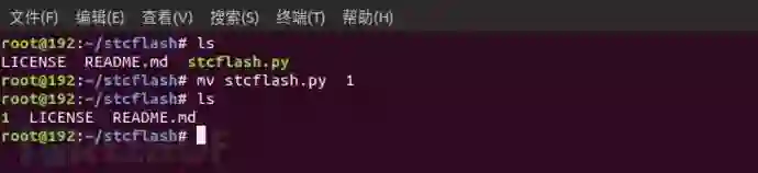 我们之前就已经把1(stcflash.py) 放到了我们的环境变量了,对就是那个我重名命为1的软件。我们在使用1这个软件的时候我们要使用root权限。当然了stcflash会自动识别我们插入的端口,但是你电脑上有多个串口的话,你可能要指定一下串口号。我这里只有这一个串口号,所以他就会自动识别,目前来看她自动识别还是听准确的。目前没啥问题!