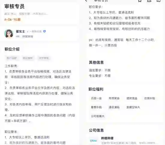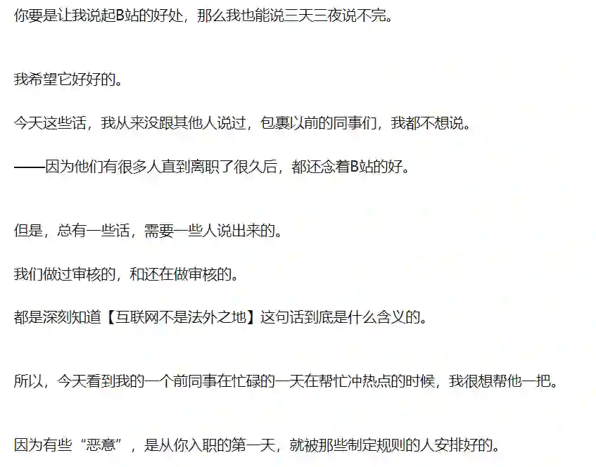 「不仅是B站,我后台躺着上万条私信涉及十多个知名互联网企业,都有在讲审核加班严重、制度不合理、员工待遇差.....」