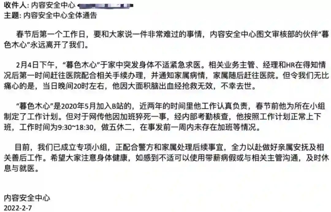 B站方面称,AI审核组的「暮色木心」在春节后的第一个工作日离世。去世当天,他按照正常工作计划上下班,时间为9:30~18:30,在晚上20时,因大面积脑出血,抢救无效去世。