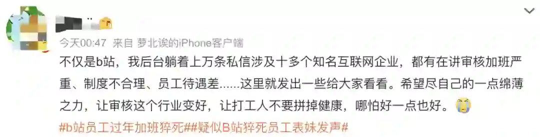 同时,还有曾同样在审核岗位工作过的前B站员工表示,「希望B站好,但是在看到这位猝死去世的员工,我一定要发声。我知道这份工作有多么辛苦。」