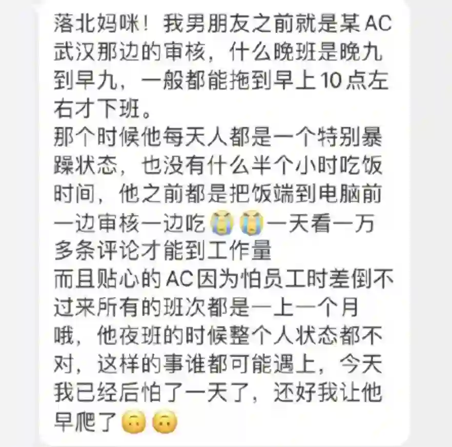 有网友称自己男友之前就是某AC武汉那边的审核,什么晚班是晚九到早九,一般都能拖到早上10点左右才下班。