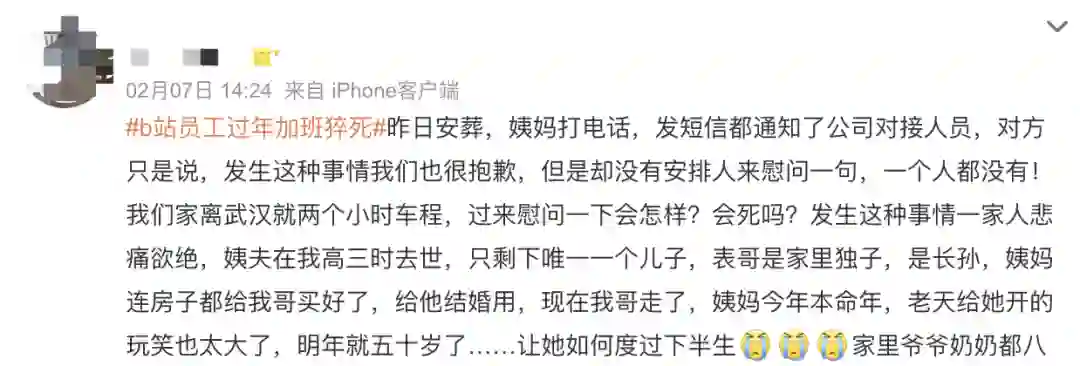 紧接着,疑似B站猝死员工的表妹发声质疑,并表示家属打电话通知B站的人事主管,然而并没有人前来慰问,逝者已于6日安葬。